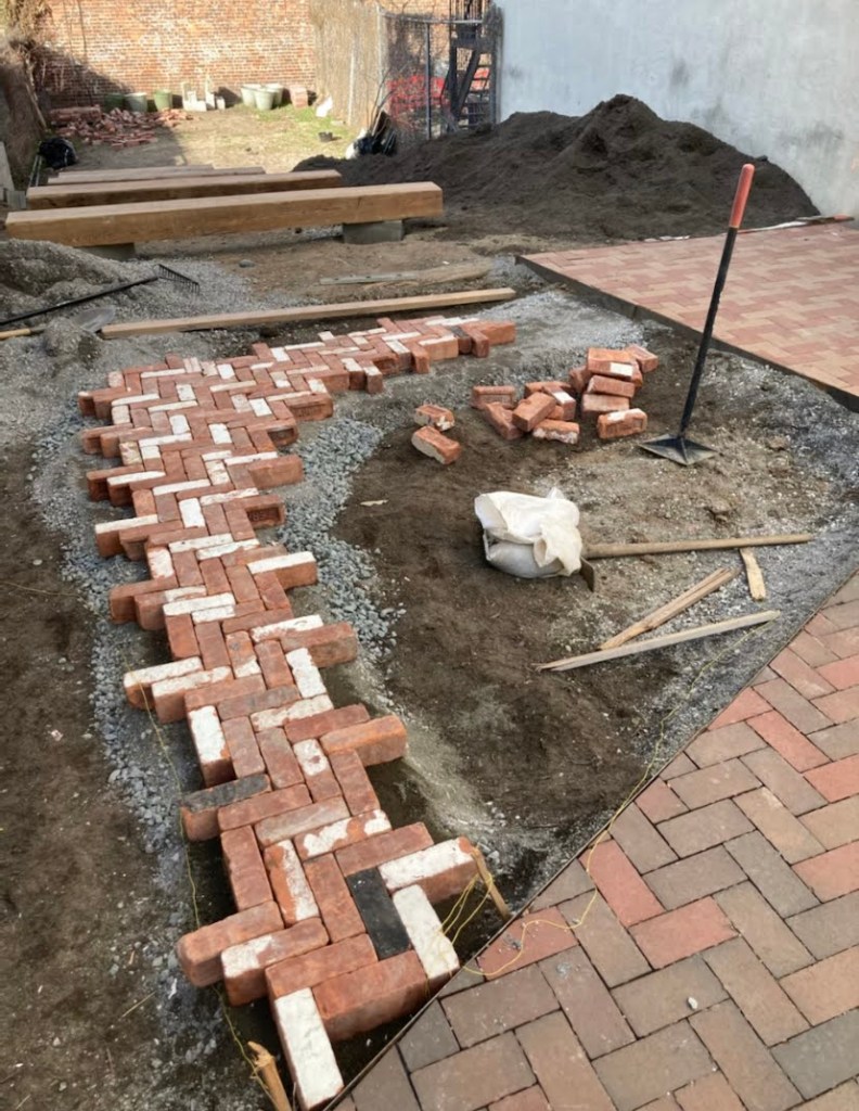 The demolished brick wall had been painted white on the exterior, so all of the salvaged bricks had one white face. Assemblage took advantage of the face variation to create a dynamic pavement pattern, alternating between unglazed and painted sides facing up.