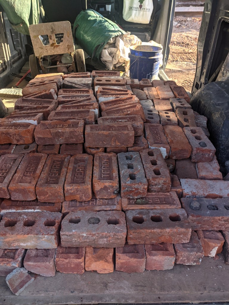 When they found surviving whole bricks, Field Form loaded them into five gallon buckets and wheelbarrows and walked them over to Dolly’s Park.