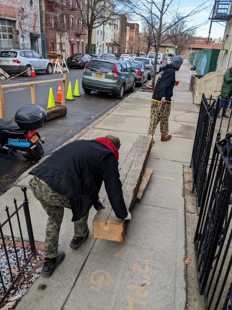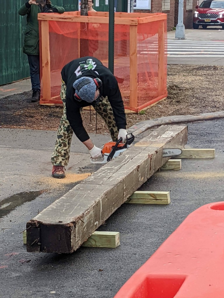 Field Form hauled the timbers onto the sidewalk outside the demolition site, cut them with a chainsaw to bench length, loaded them one by one onto a dolly cart and wheeled them around the corner to the Dolly’s Park site.